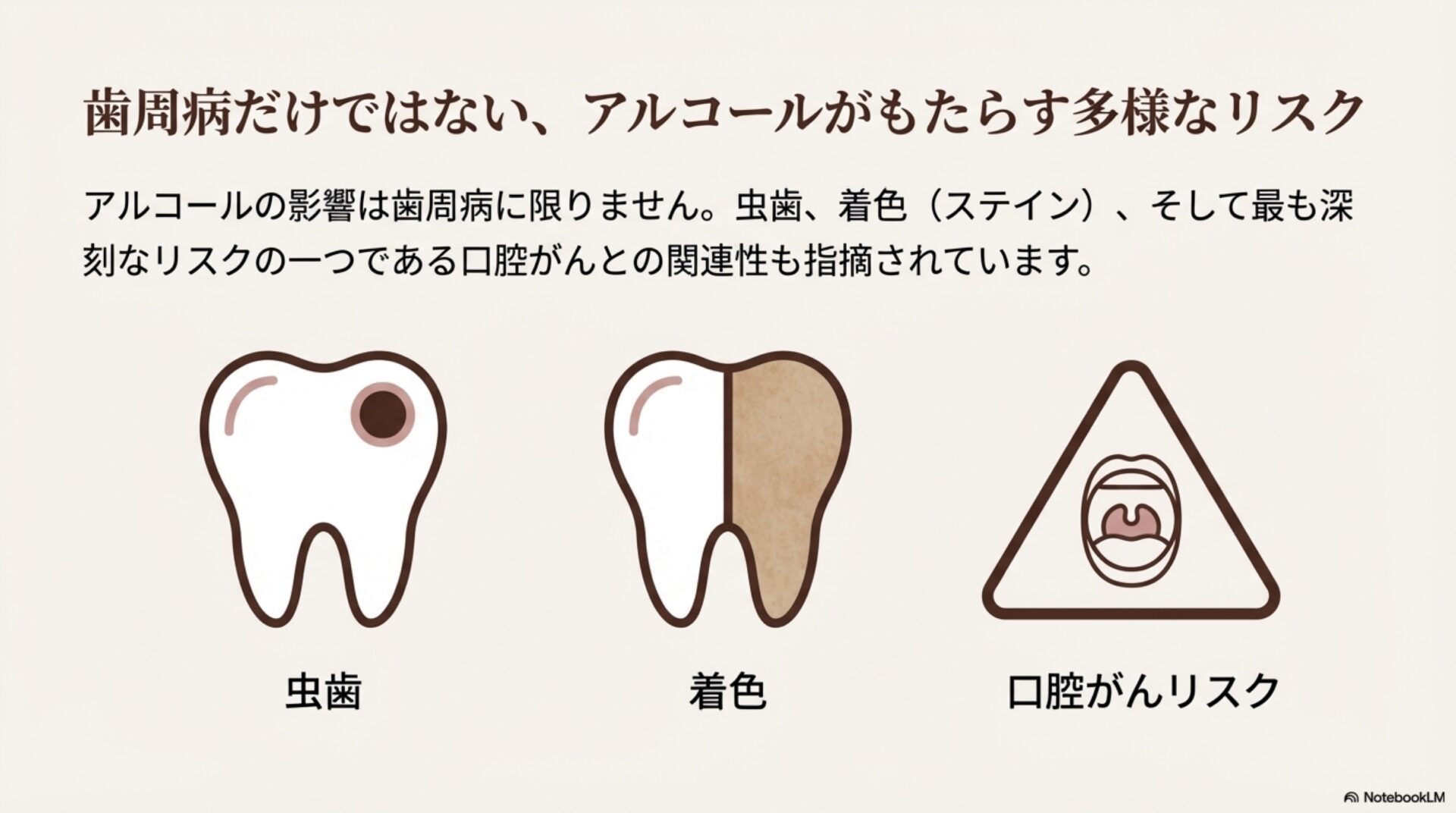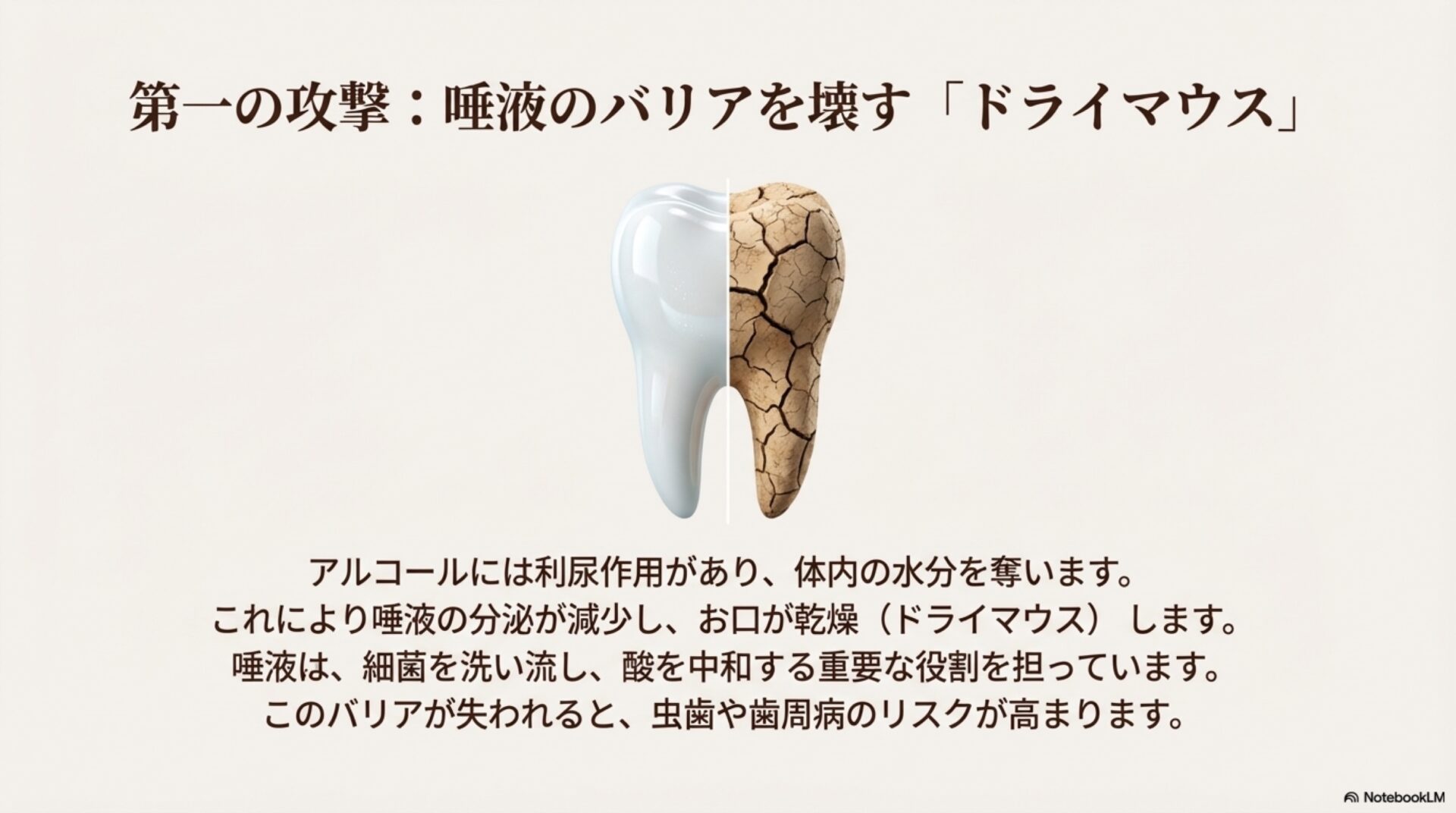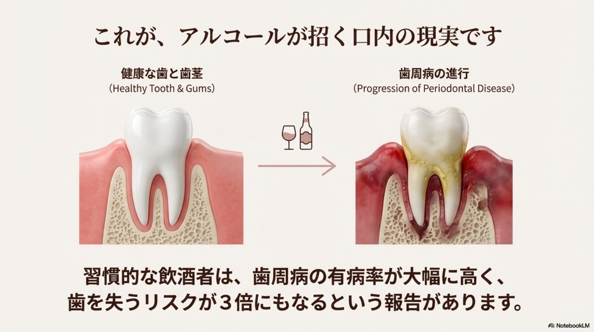 アルコールの影響は全身に及び、体の防御・修復システム全体を弱体化させます。そして、その影響が最も早く、そして目に見える形で現れる主戦場の一つが「お口の中」なのです。