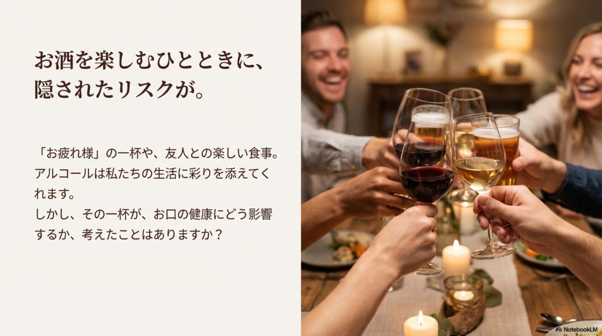 仕事終わりの一杯や、友人との楽しい食事会。私たちの生活において、アルコールはコミュニケーションを円滑にし、リラックスする時間を与えてくれる身近な存在です。多くの人がアルコールの肝臓への影響は知っていますが、実は、お口の健康にも深刻なリスクをもたらすことはあまり知られていません。