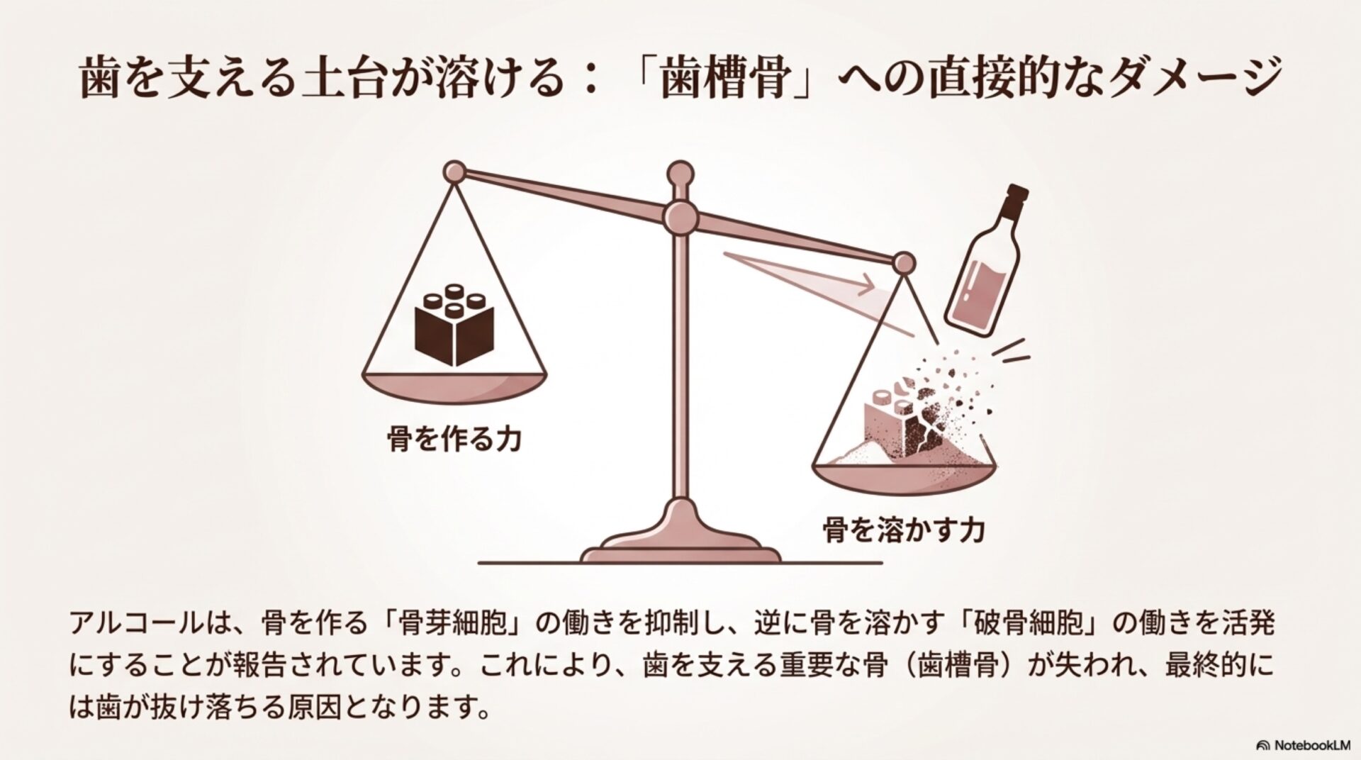 アルコールは、あなたの歯を支える重要な土台である「歯槽骨」を、見えないところで静かに溶かしていきます。