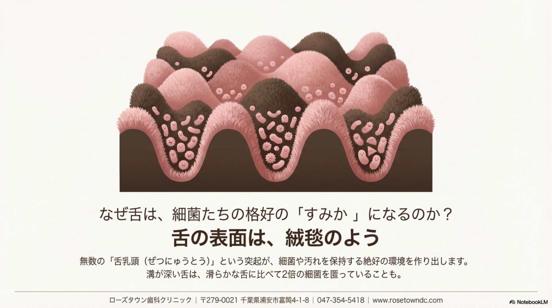 舌苔の正体は、剥がれ落ちたお口の中の上皮細胞、食べかす、そして非常に多くの微生物が固まってできた「バイオフィルム」と呼ばれる膜です。身近な例でいえば、川の中の石の表面にあるぬるぬるとした膜のようなものです。舌の表面には、舌乳頭(ぜつにゅうとう)という細かい溝や突起がたくさんあり、この複雑な構造が細菌や汚れを溜め込みやすい環境を作っています。特に、舌の溝が深い方は、滑らかな舌の方に比べて2倍もの細菌を溜め込んでいるというデータもあります。