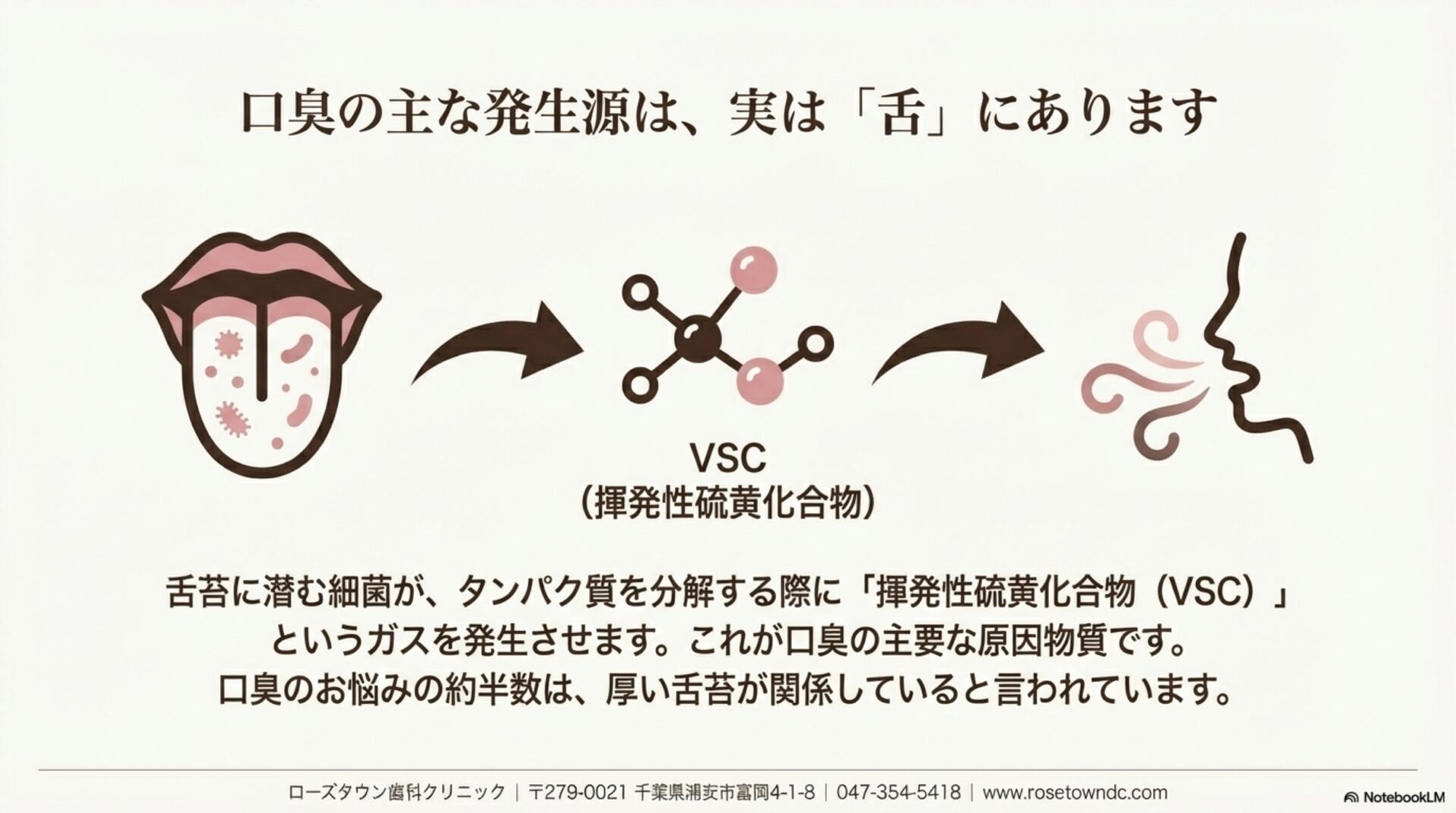 口臭の元となるのは、「揮発性硫黄化合物(VSC)」というガスです。このガスは、舌苔の中に潜む細菌がタンパク質を分解する過程で産生されます。ある研究では、「口臭が口内由来の場合、およそ半数のケースで厚い舌苔が存在する」ことが報告されており、舌苔と口臭には非常に強い関連性があることがわかります。特に歯周病があると、歯周ポケットから流れ出た白血球などが舌に沈着し、舌苔が厚くなることで口臭がさらに強まることも分かっています。