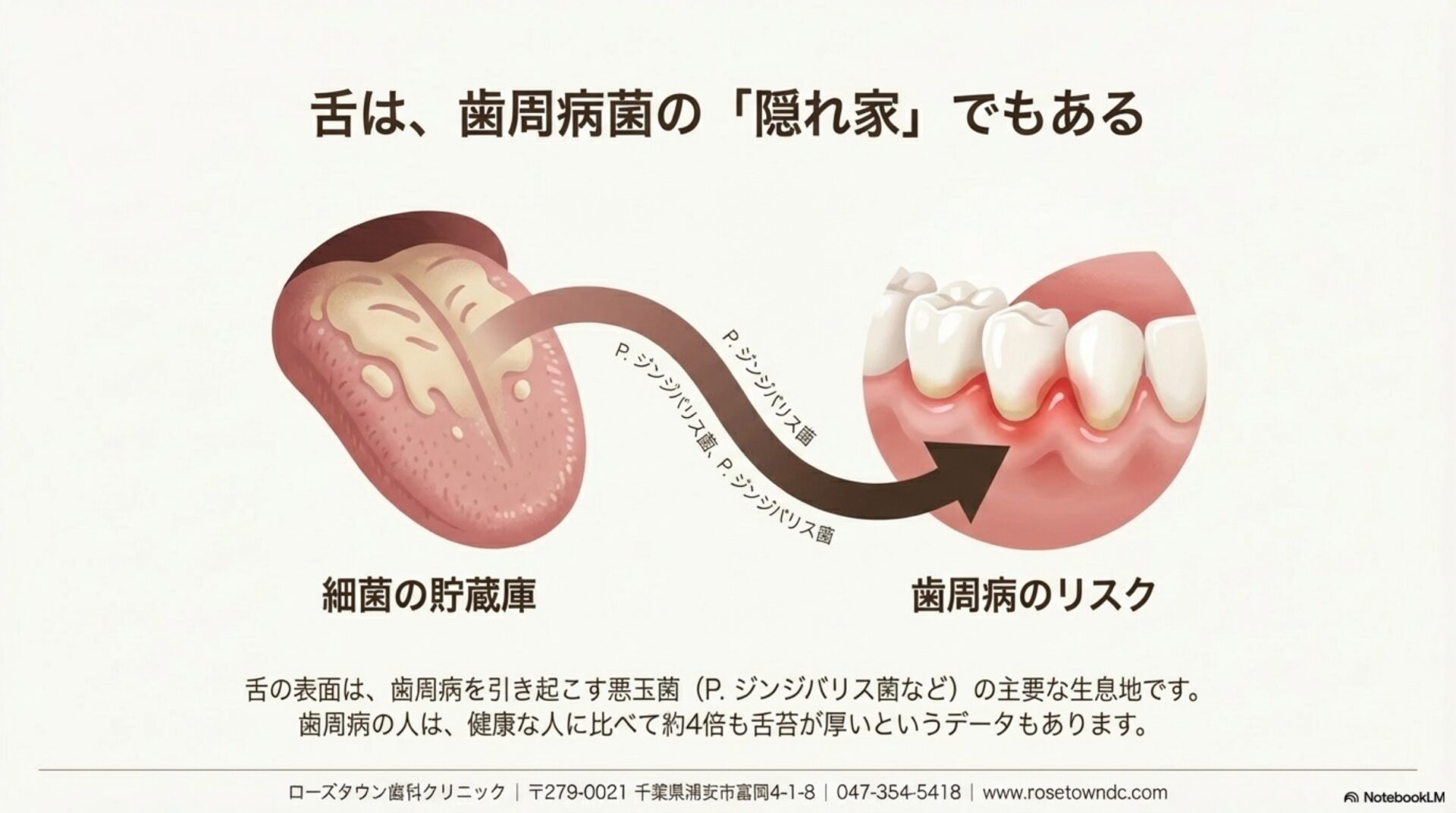 事実、舌の上が口の中の他の場所よりも細菌数が多くなることがあり、これが様々なトラブルの温床となります。例えば、歯周病の原因となる細菌(ポルフィロモナス・ジンジバリスなど)の温床となり、お口全体の健康を脅かすことにも繋がります。この細菌のすみかこそが、実は口臭(真実3)や味覚の低下(真実4)の直接的な原因となるのです。