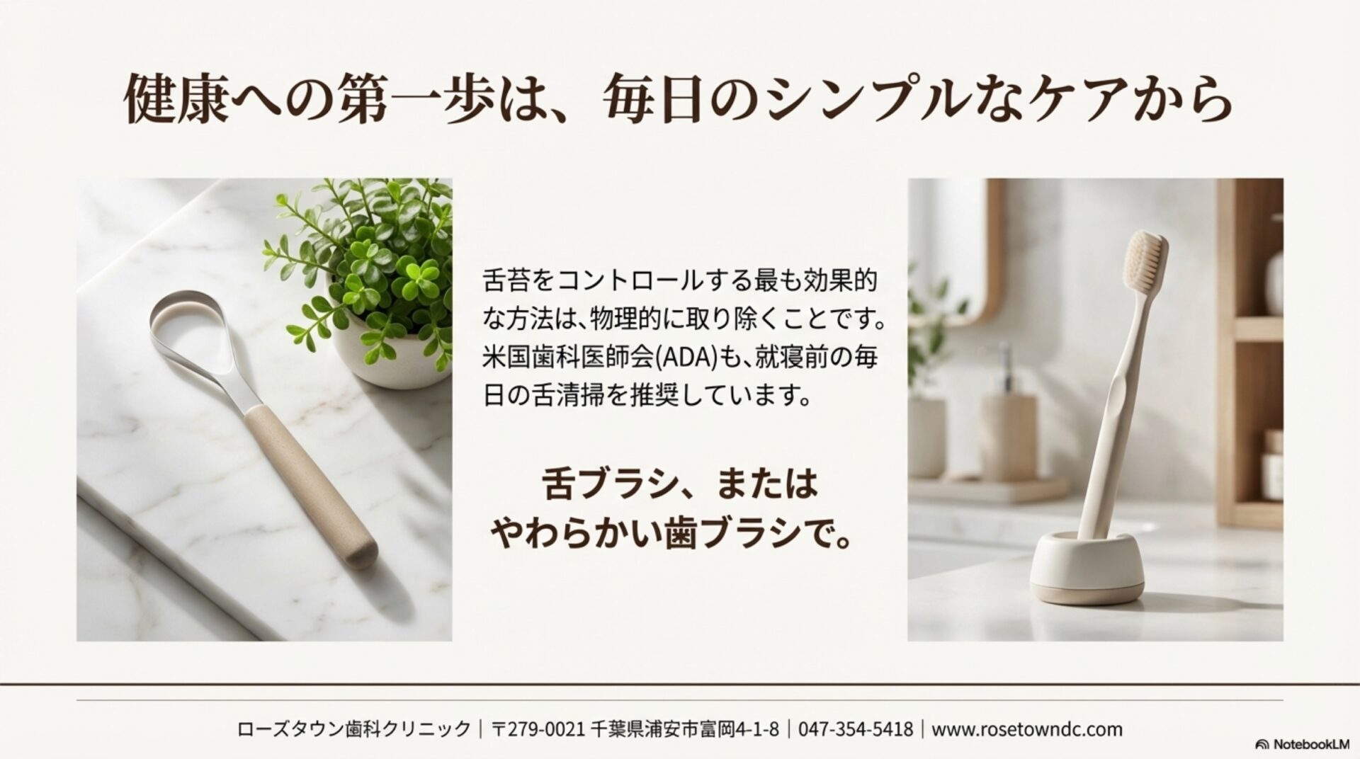 これまで見てきたように、舌苔は単なる見た目の問題ではありません。口臭や味覚の低下だけでなく、歯周病のリスクを高め、さらには全身の健康状態を知るための重要な手がかりにもなります。毎日の歯磨きのついでに、ほんの数十秒、舌のケアを加える習慣が、あなたの口内環境を改善し、未来の健康を守る第一歩となります。