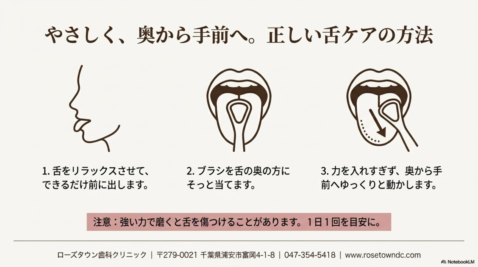 - 力の入れ具合: ゴシゴシと強くこする必要はありません。舌の奥から手前に向かって、優しくなでるように数回動かすだけで十分です。力を入れすぎると、味覚を感じる大切なセンサーである味蕾を傷つけてしまうだけでなく、逆説的ですが、舌の表面が荒れてさらに舌苔が付着しやすい環境を作ってしまうことにもなりかねません。