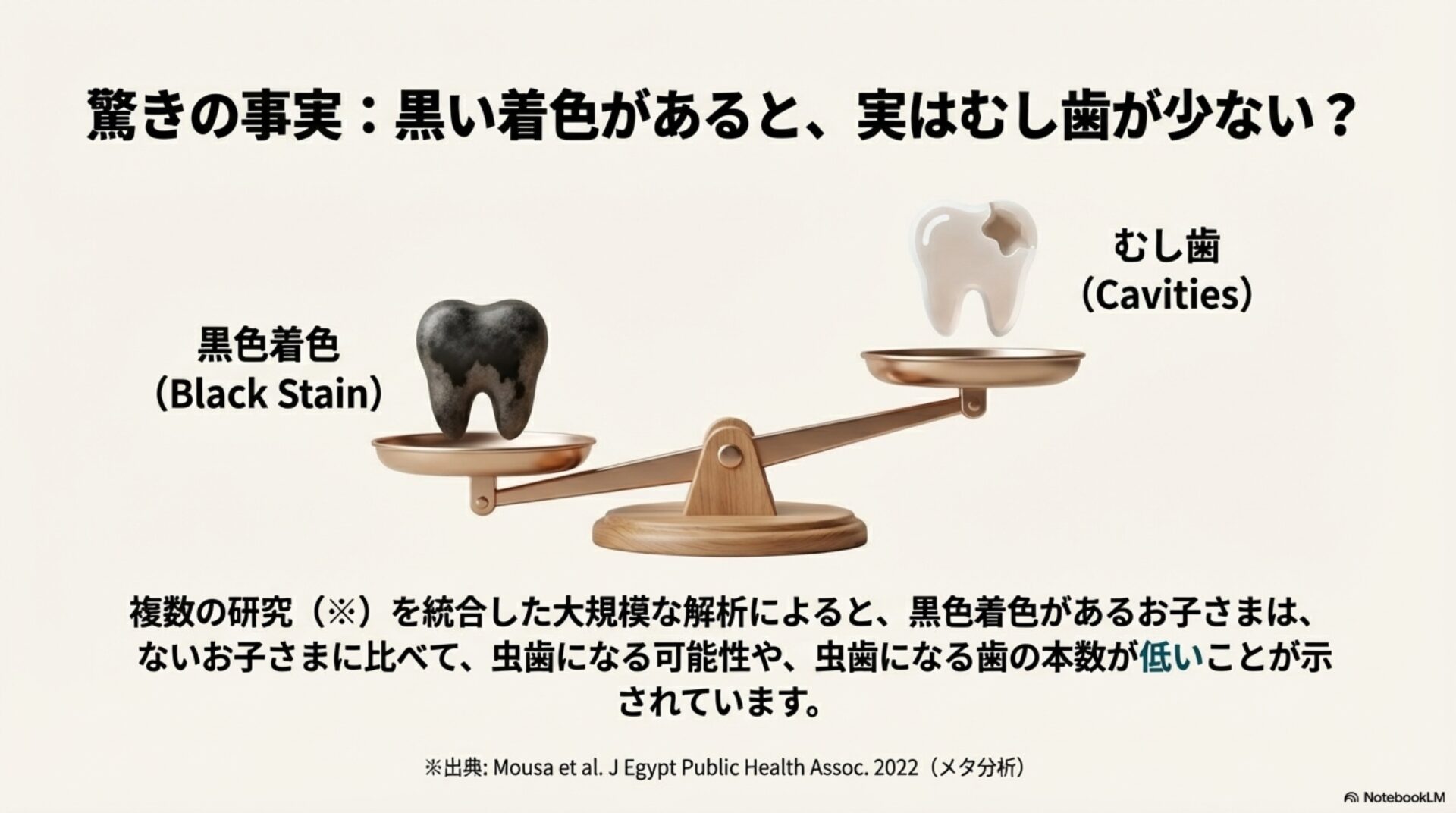保護者の方にとって、ブラックステインは審美的な問題であり、何より虫歯ではないかという心配の種でしょう。しかし、複数の研究結果を統合・分析したメタ分析によると、ブラックステイン(BS)がある子供は、ない子供に比べて虫歯リスクが低いことが一貫して示されているのです。