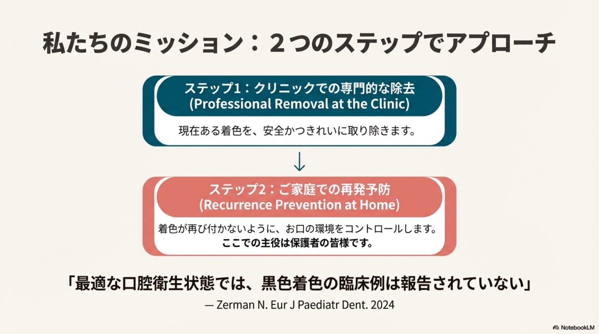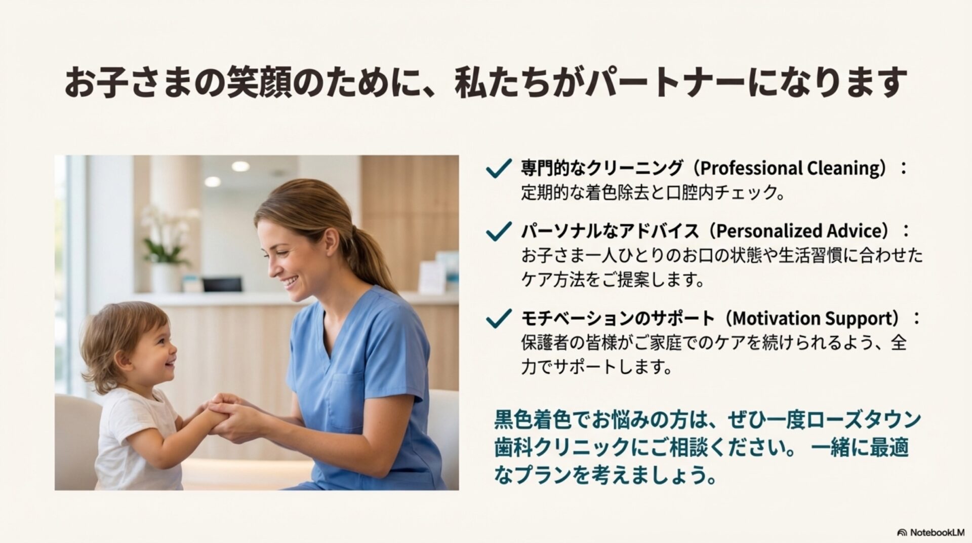 これは、子供一人ひとりのお口の環境がユニークであり、その特性を科学的に把握することで、「あなたのお子さんは、こういう細菌チームが優勢なので、この部分を特に注意してケアしましょう」といった、オーダーメイドの予防戦略が可能になる未来を示唆しています。ブラックステインもまた、その子独自の口腔環境を示す一つの重要なサインなのです。