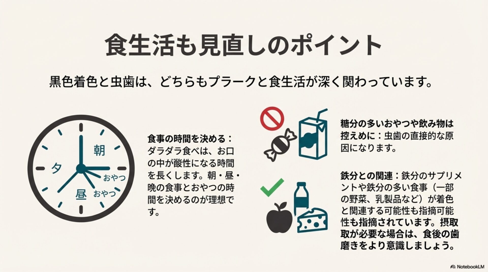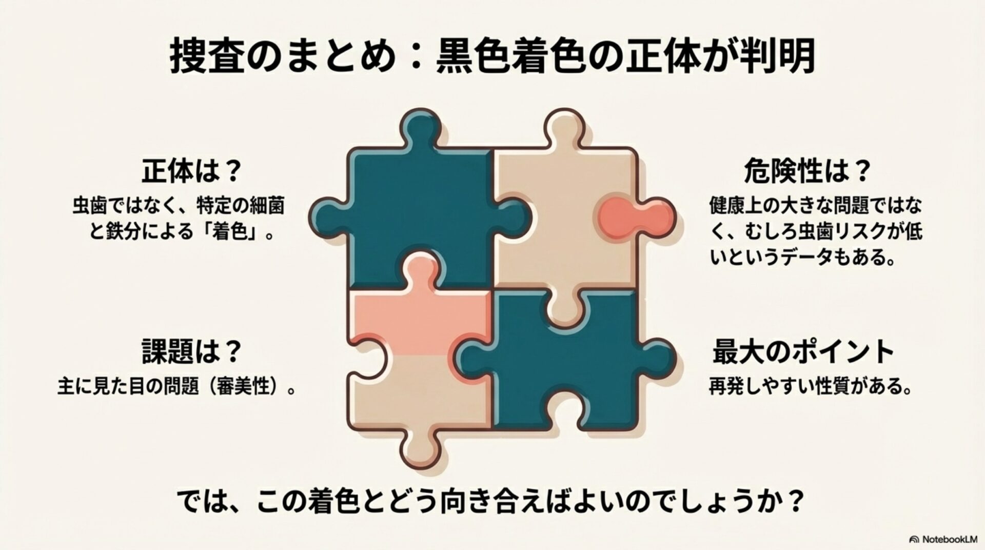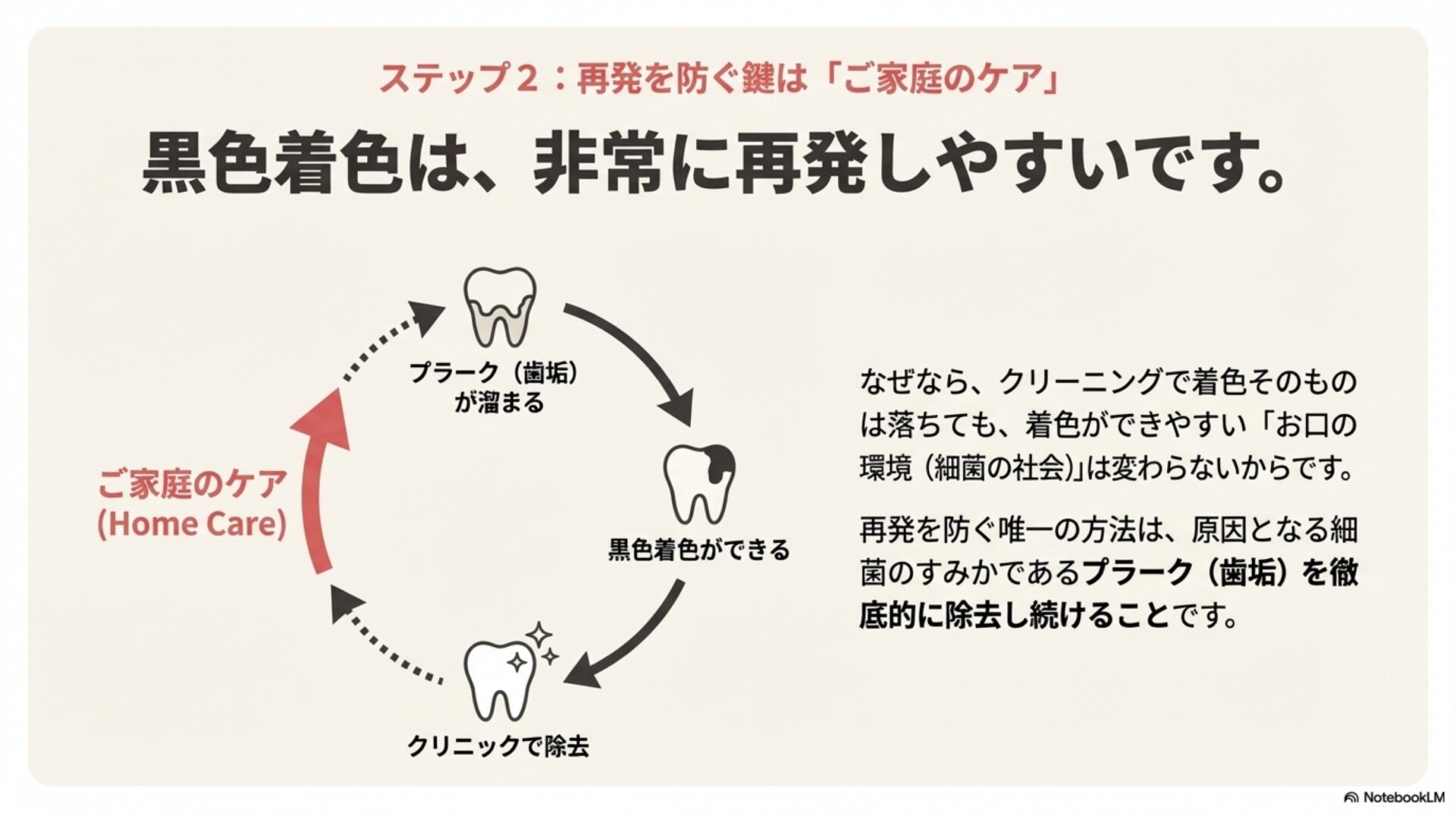 - 良い知らせ: ブラックステインは、虫歯菌が住みにくい環境を示す「虫歯になりにくいポテンシャル」のサインかもしれません。