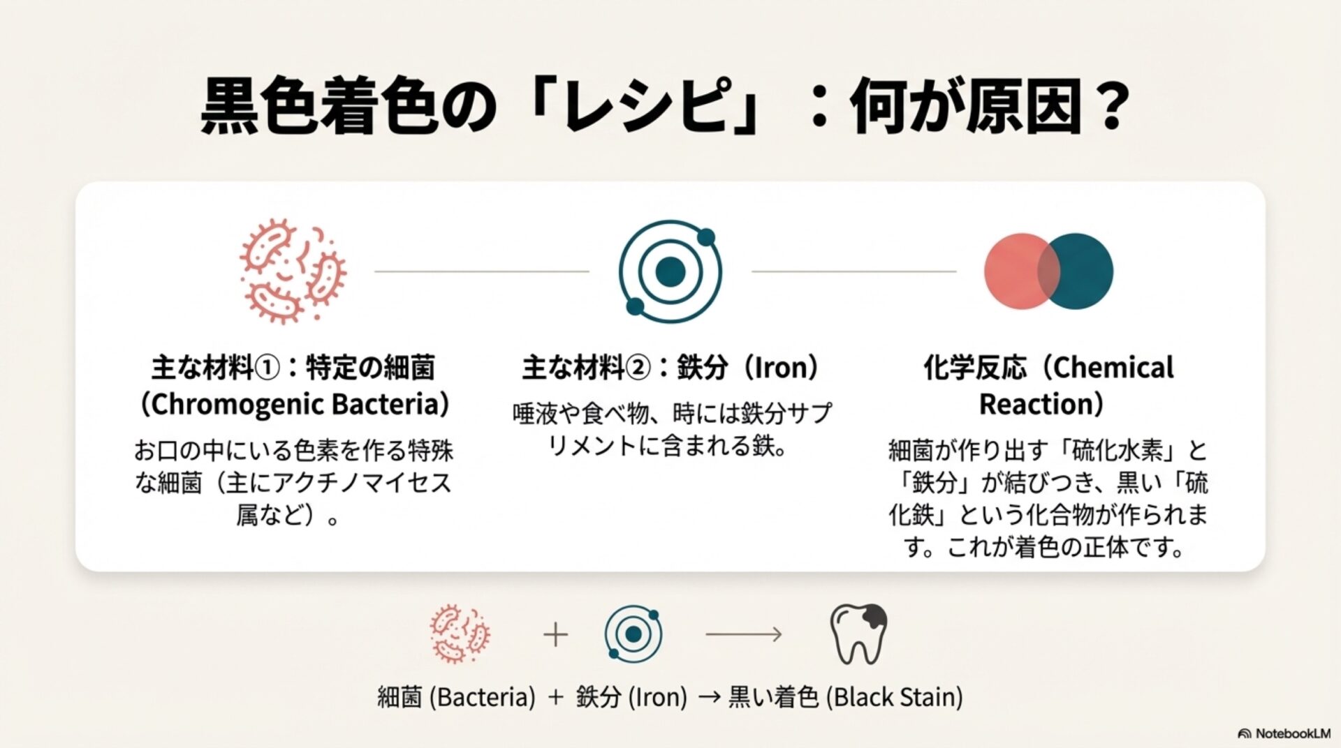 - 化学反応: 細菌が作り出した硫化水素と、唾液中の鉄分が結びつくことで、黒い「硫化第一鉄」が生成され、歯の表面に固く付着するのです。