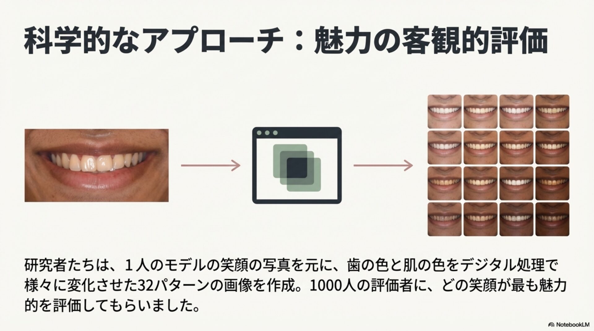 この記事では、そんな疑問に科学的な視点から光を当てる、非常に興味深い研究をご紹介します。これは、南インドの1000人を対象に、モデルの歯や肌の色をデジタル加工で様々に変化させた写真を見てもらい、どのような笑顔が「魅力的」と感じられるかを調査したものです。この研究は、私たちの常識を裏付ける発見と、いくつかの意外な真実を明らかにしました。