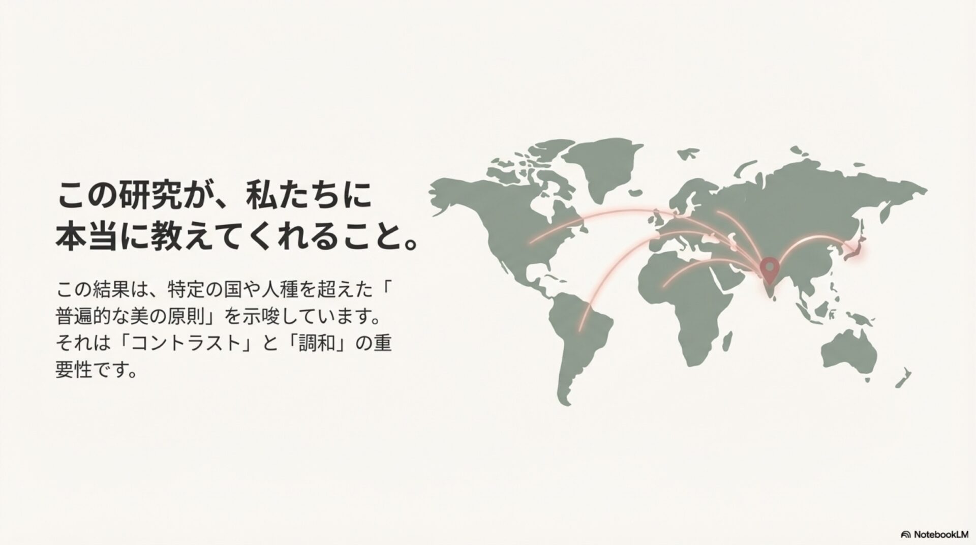 ここで一つ、大切な注意点をお伝えします。この研究は、あくまで南インドの人々を対象としたものであり、また評価にはデジタル加工された写真が使われました。美的感覚は文化によっても異なるため、この結果が世界中のすべての人に当てはまるわけではありません。しかし、こうした科学的な研究は、私たちが「美しさ」について考えるための重要な第一歩であり、客観的なヒントを与えてくれます。