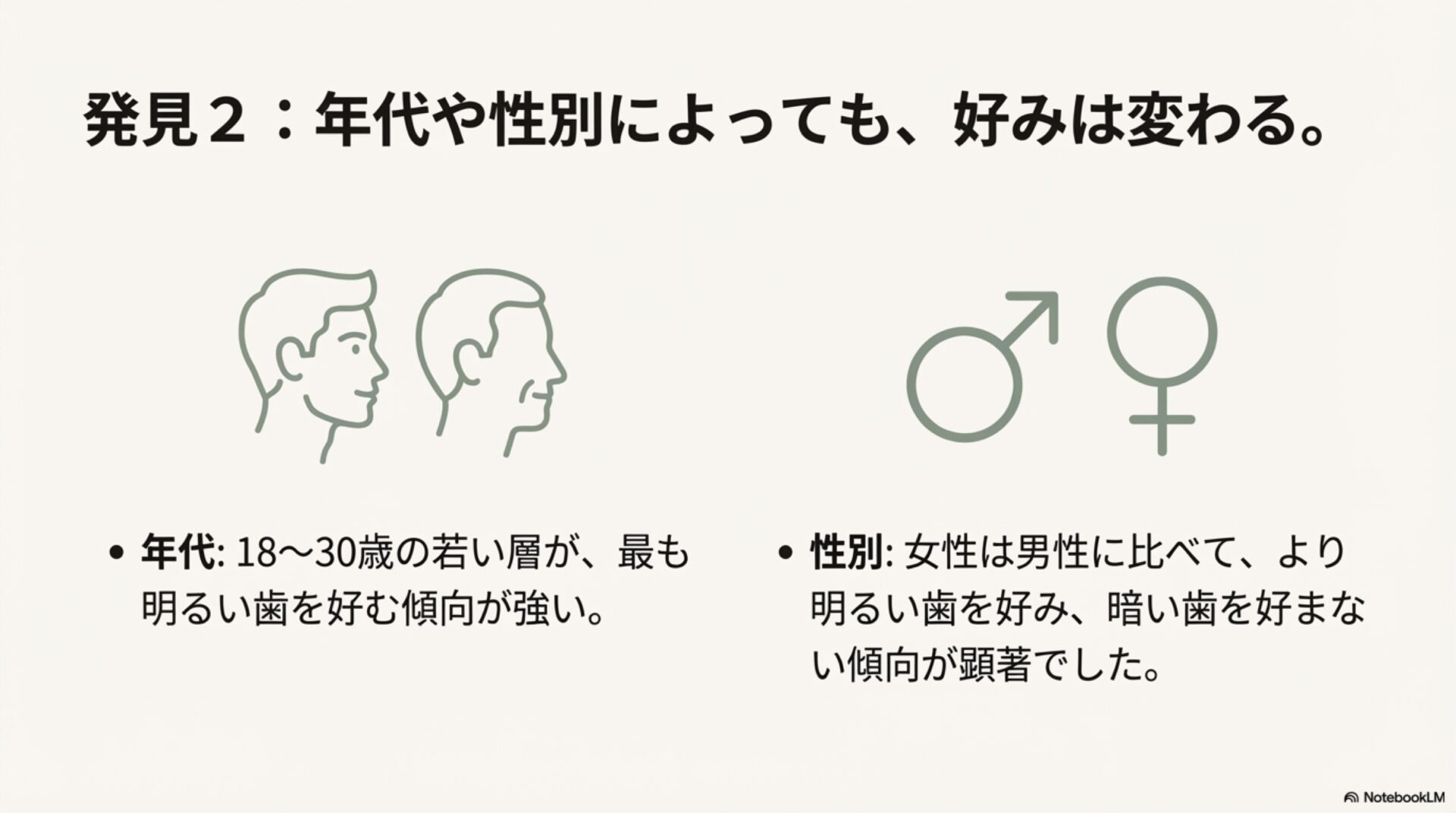 より詳しく見ていくと、特に年齢や性別によって好まれる歯の色に微妙な違いがあることが分かりました。