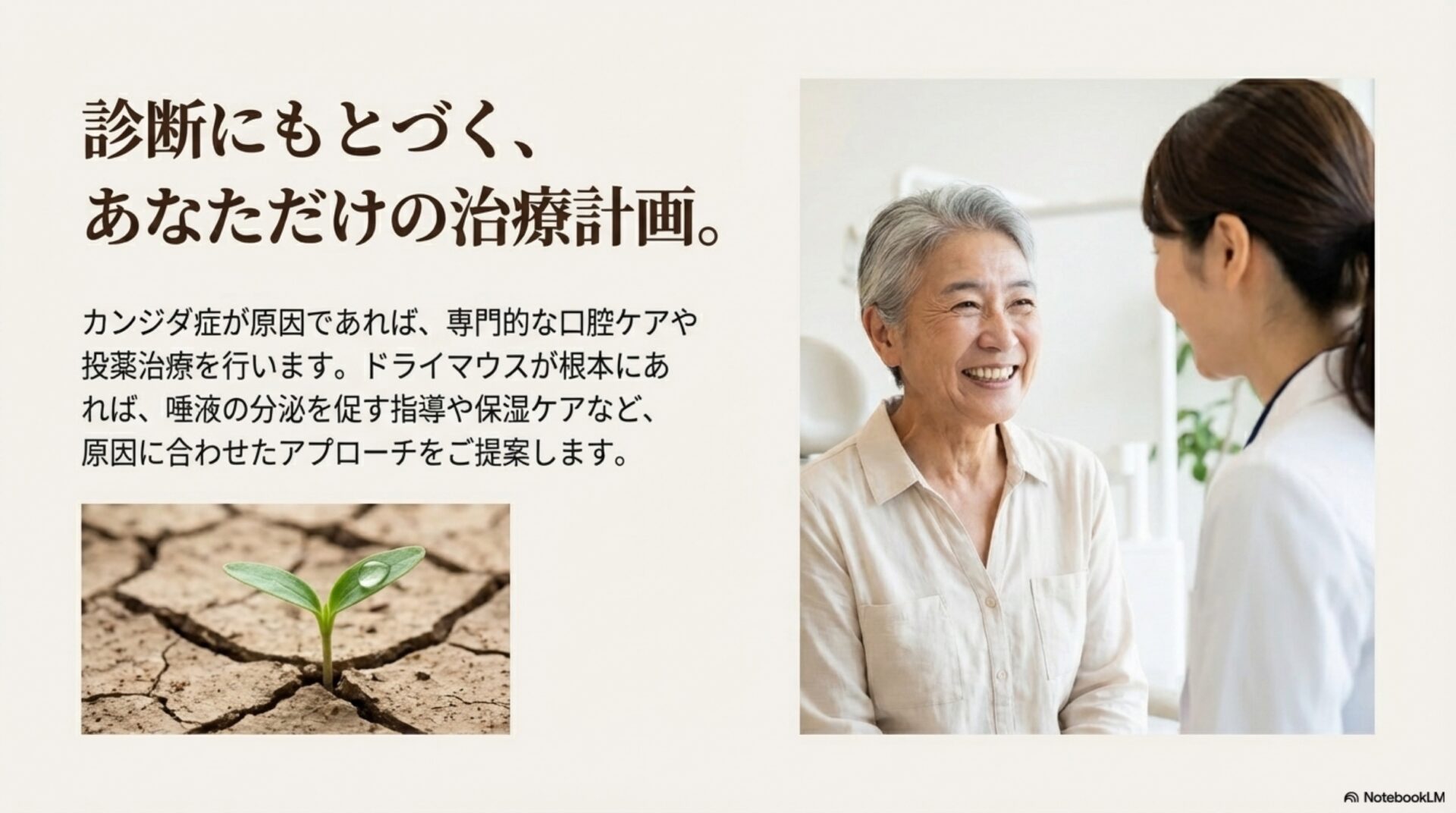 まず、唾液の減少(新常識①)が、お口の中の防御システムを弱め、トラブルの舞台を整えます。この脆弱になった環境では、丁寧な歯磨きだけでは防ぎきれない(新常識②)問題が進行します。そしてその舞台裏では、カンジダ菌を含む多様な微生物が複雑に協力し合う「ディスバイオシス」というミクロのドラマ(新常識④)が繰り広げられているのです。しかも、この深刻な状態は必ずしも強い痛みを伴わない(新常識③)ため、気づかぬうちに進行する可能性すらあります。