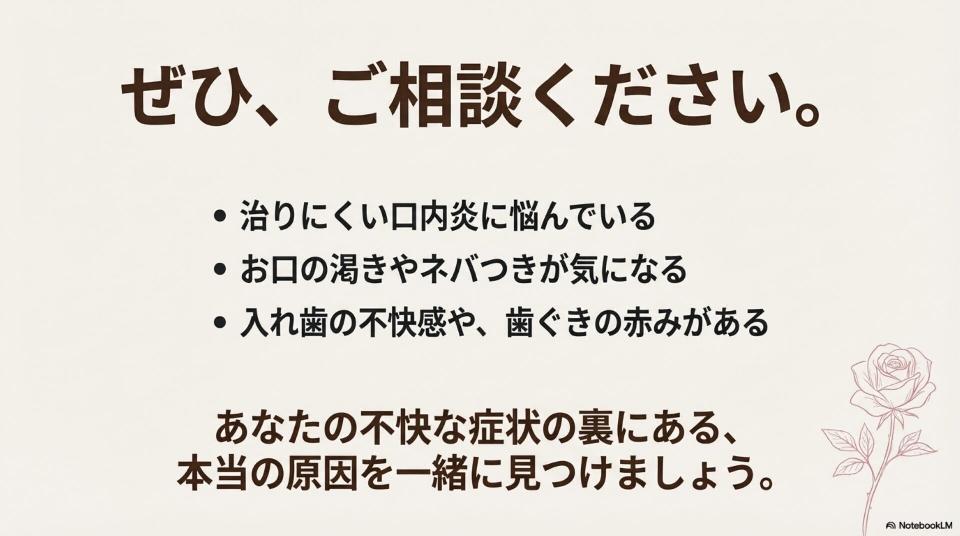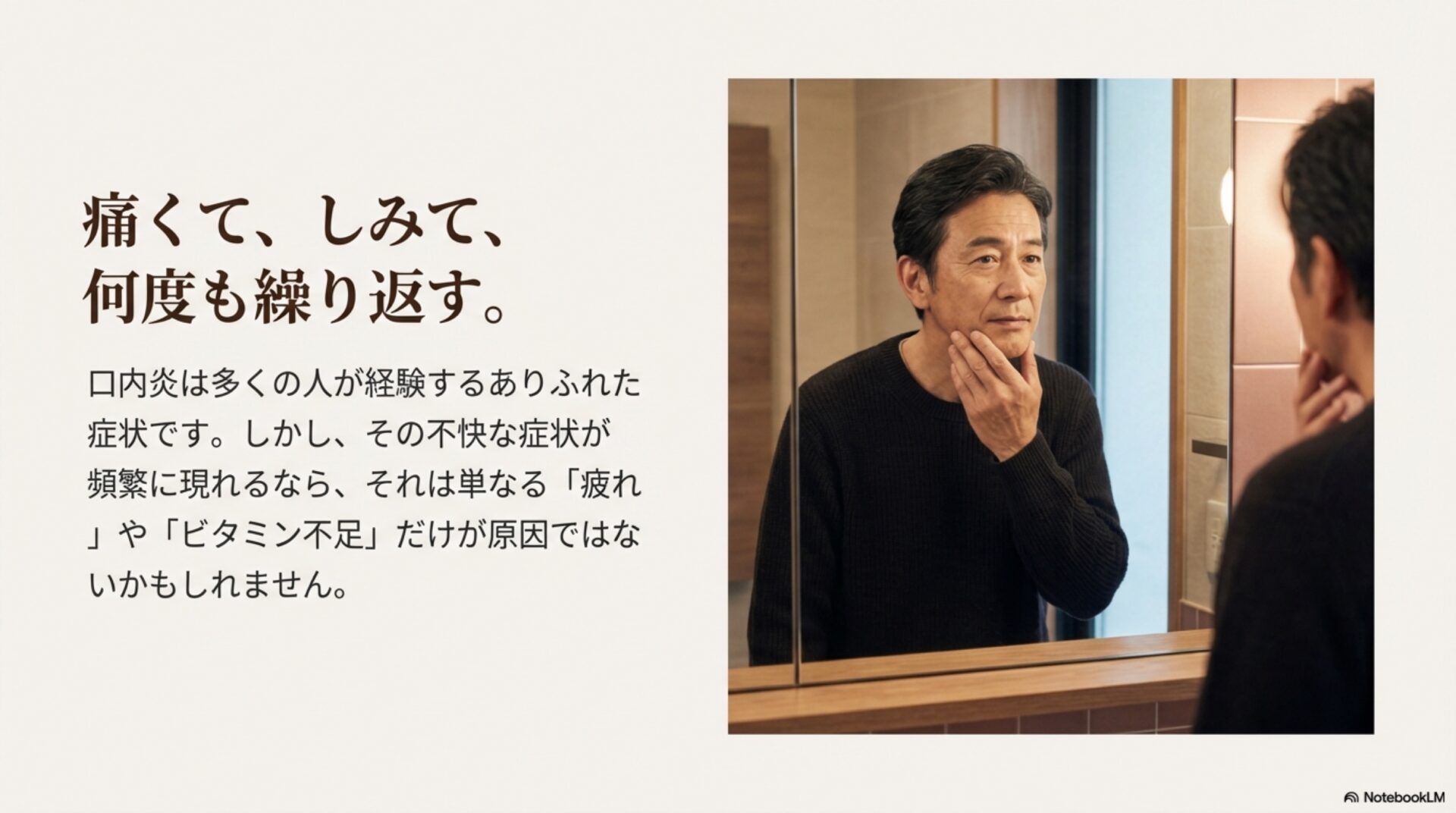 あなたの口内炎、本当の原因は何だと思いますか?この記事をきっかけに、ご自身のお口の健康について、少し違う角度から見直してみてはいかがでしょうか。