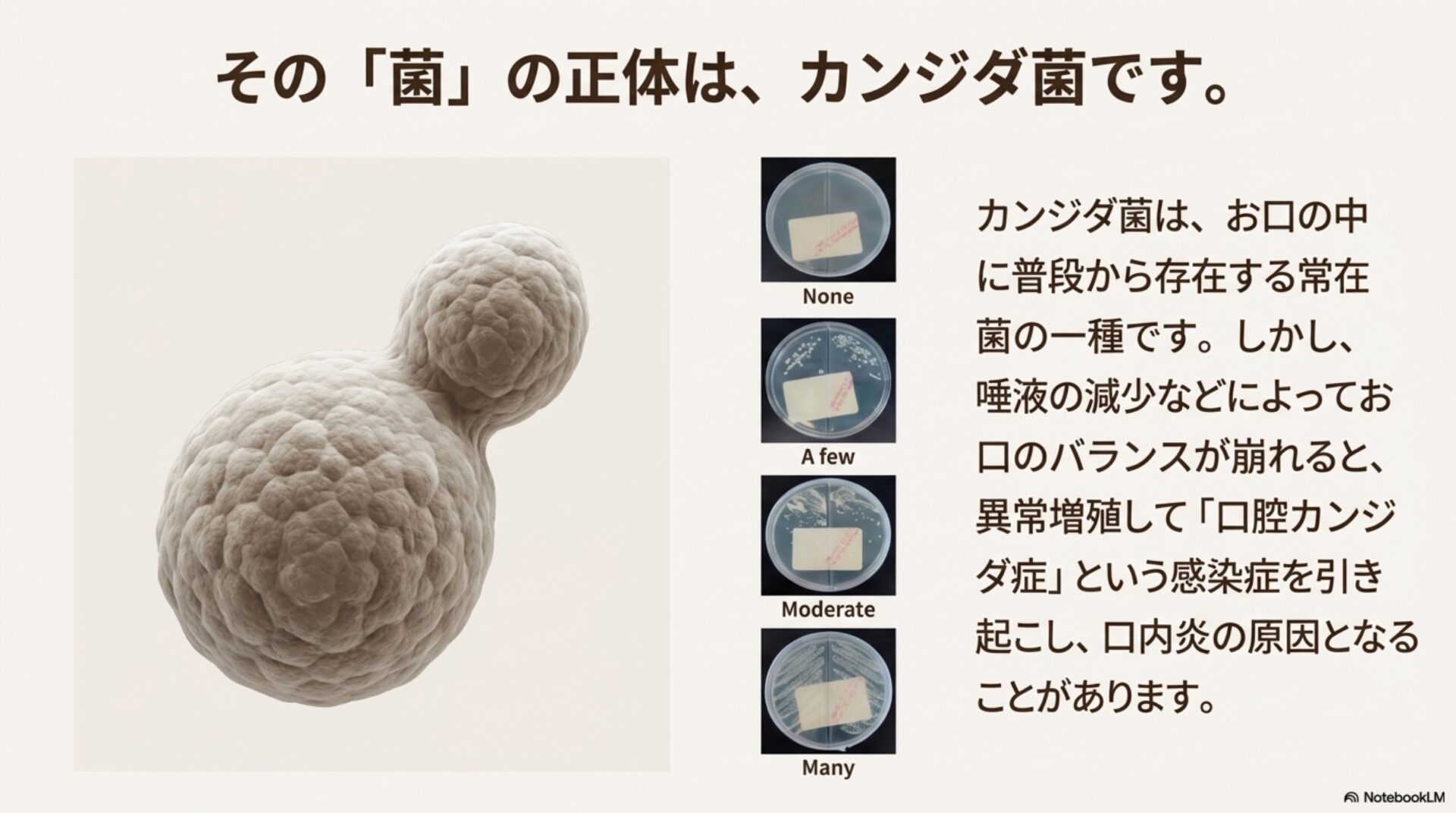 「お口の中にカビ(カンジダ菌)が増えるのは、不潔にしているからだ」というイメージをお持ちではないでしょうか。もちろん口腔衛生は大切ですが、それだけが原因とは限りません。