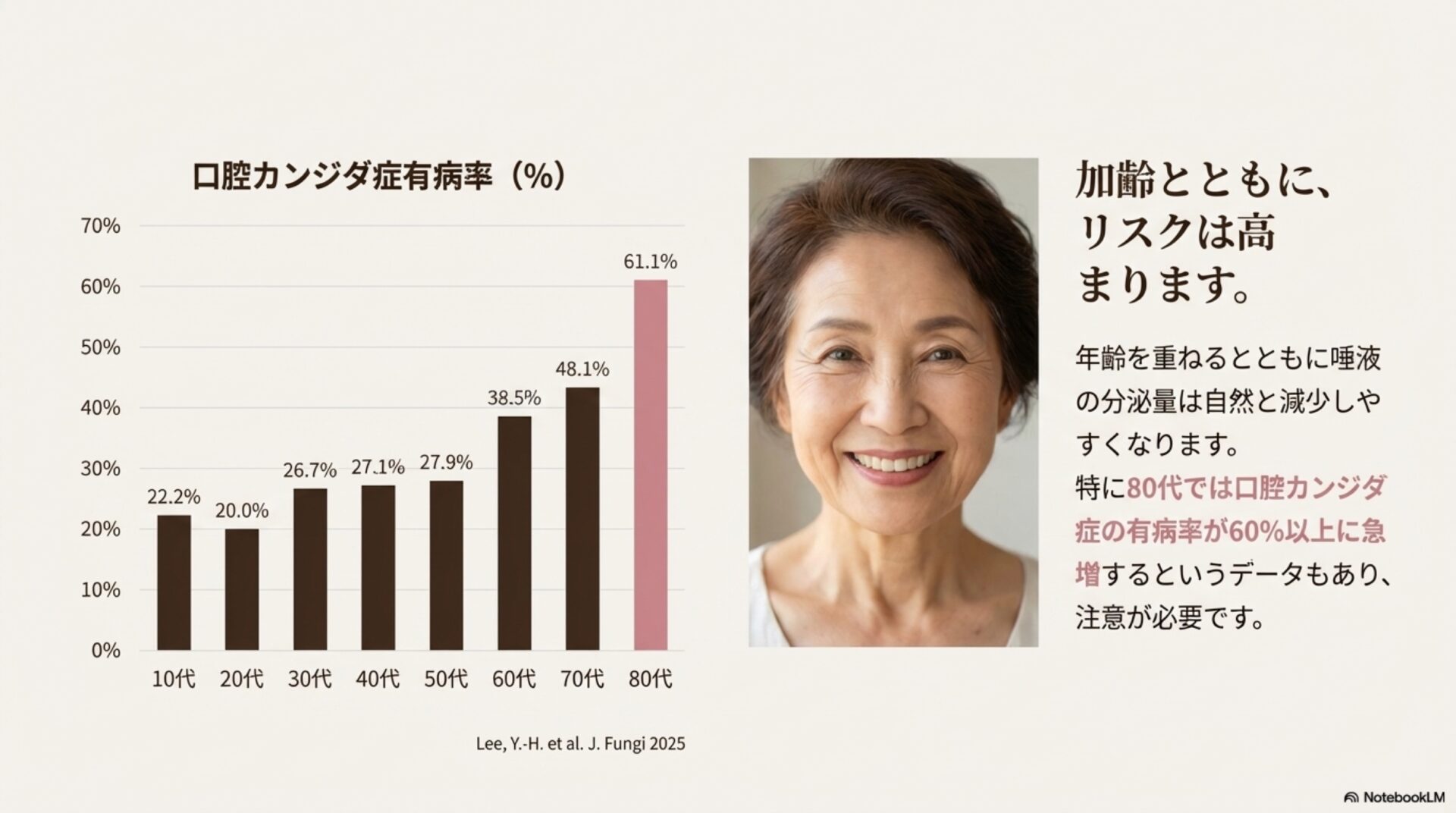 口内炎の一種である「口腔カンジダ症」は、年齢とともにリスクが高まると考えられてきました。実際、ある研究では64.5歳が発症を予測する一つの目安とされています。