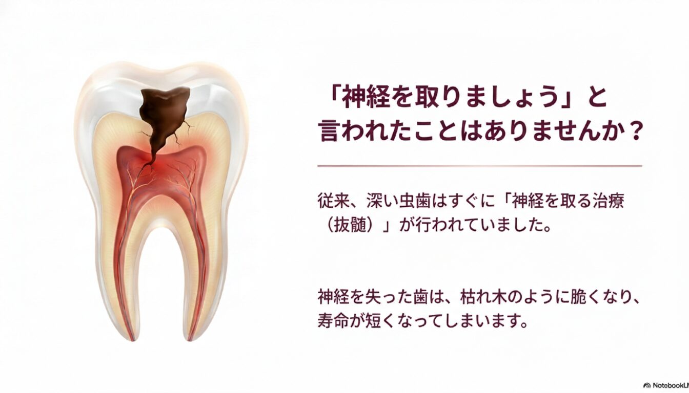 歯科医院で「虫歯が深くて神経まで達していますね。神経を抜く治療(根管治療)が必要です」と告げられたとき、多くの患者さんの心は不安でいっぱいになります。「歯の神経を抜く」という言葉は、痛みを伴う複雑な治療や、歯がもろくなってしまう未来を連想させるからです。長年、深い虫歯の治療法は、神経をすべて取り除く根管治療が唯一の選択肢だと考えられてきました。
