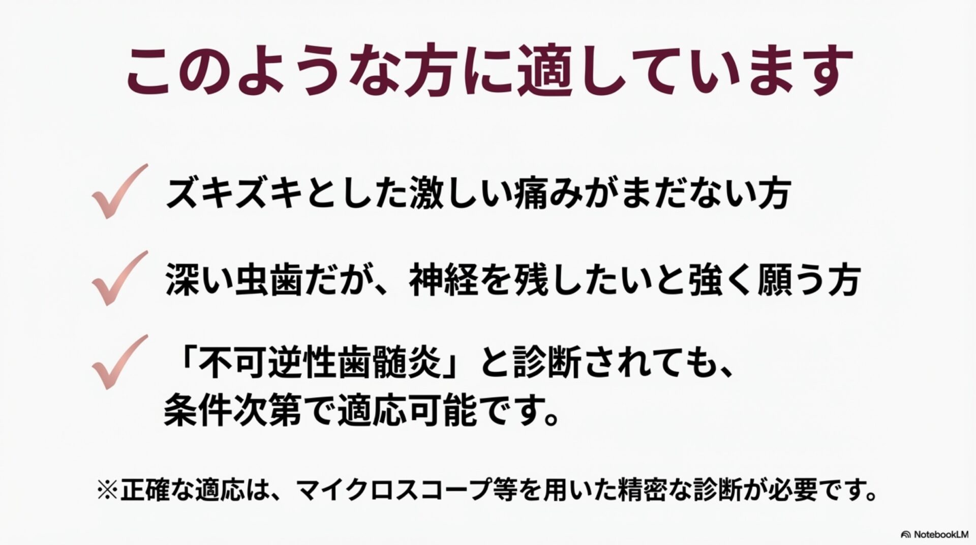 - 「私の虫歯の状態は、神経を残せる可能性がある『歯髄保存療法』の対象になりますか?」