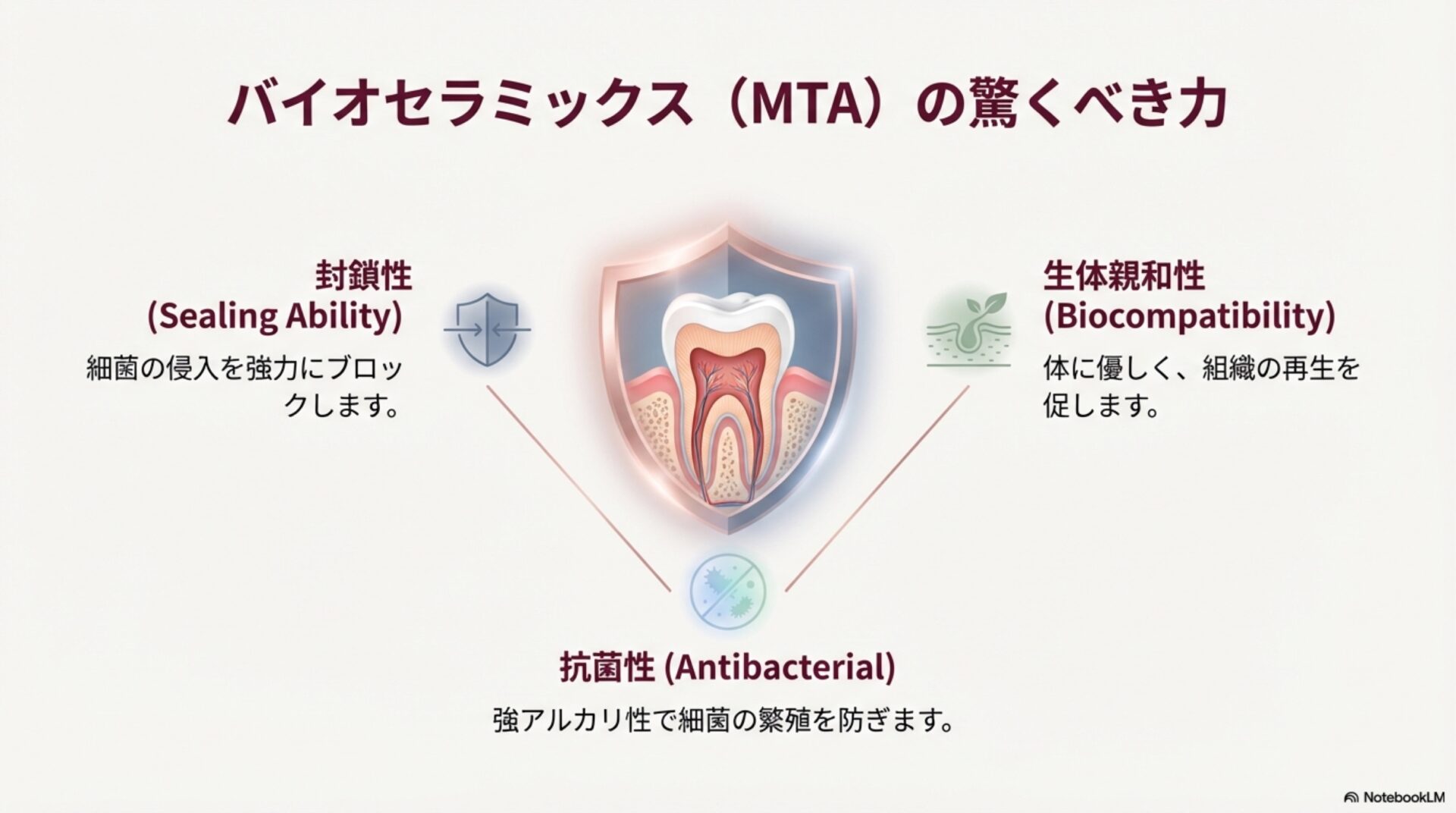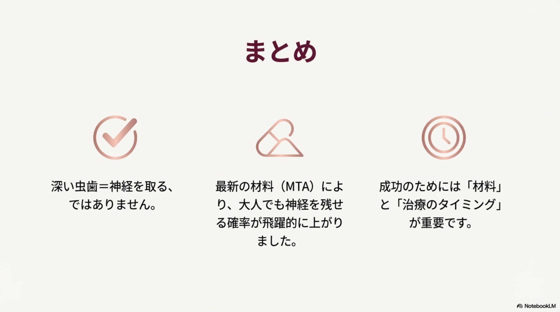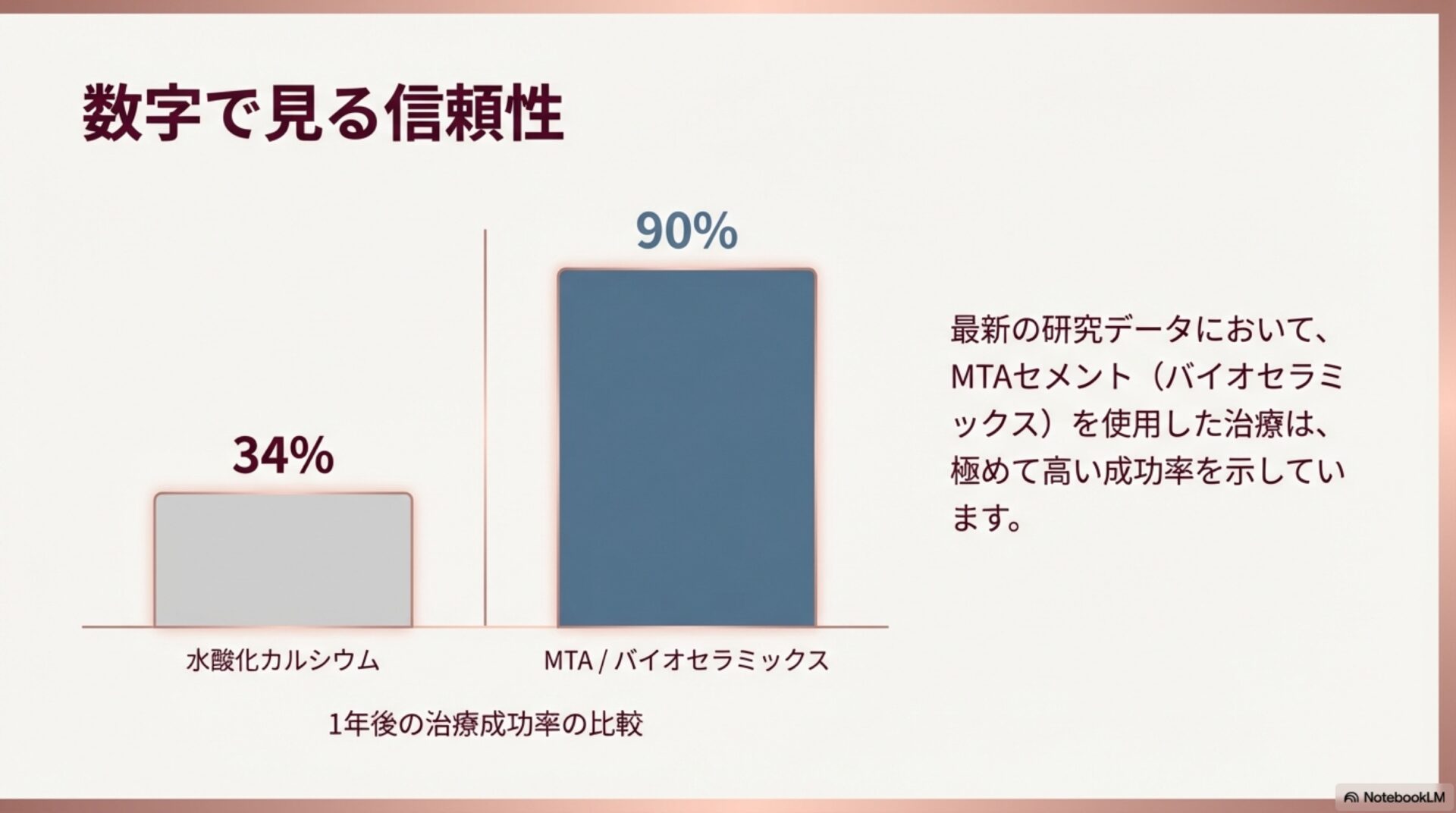 この事実は、現代の歯科医療で使われる材料が、かつてないほど高い予測性をもって歯の神経を救うことを可能にしている、という力強い証拠です。