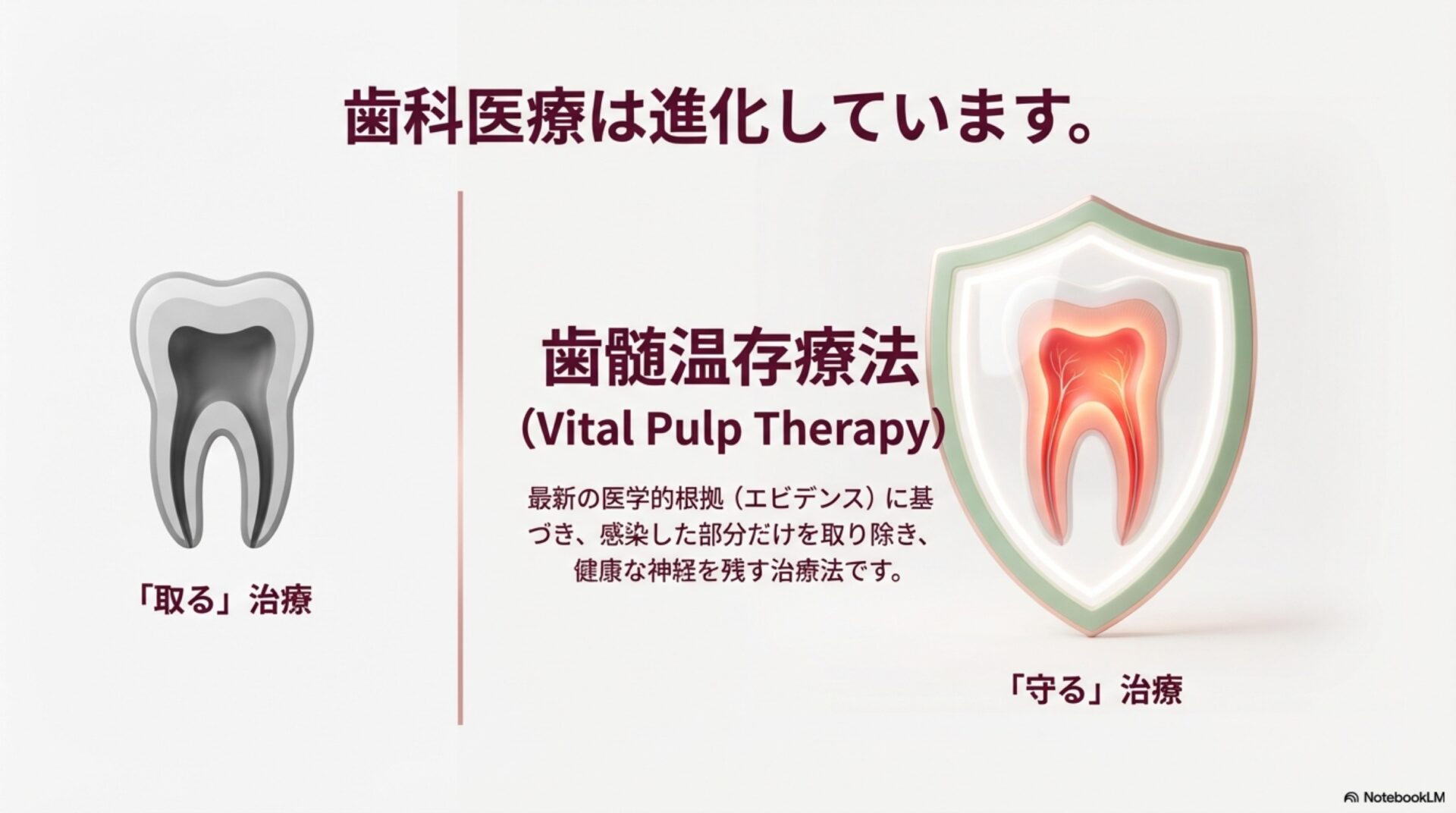 材料の革新と技術の進歩により、現代の歯科医療は、深い虫歯に侵された歯であっても、その生命力(歯髄の活力)を救うための強力な手段を手に入れました。これは、かつてのように自動的に根管治療が選択されていた時代からの大きな前進です。