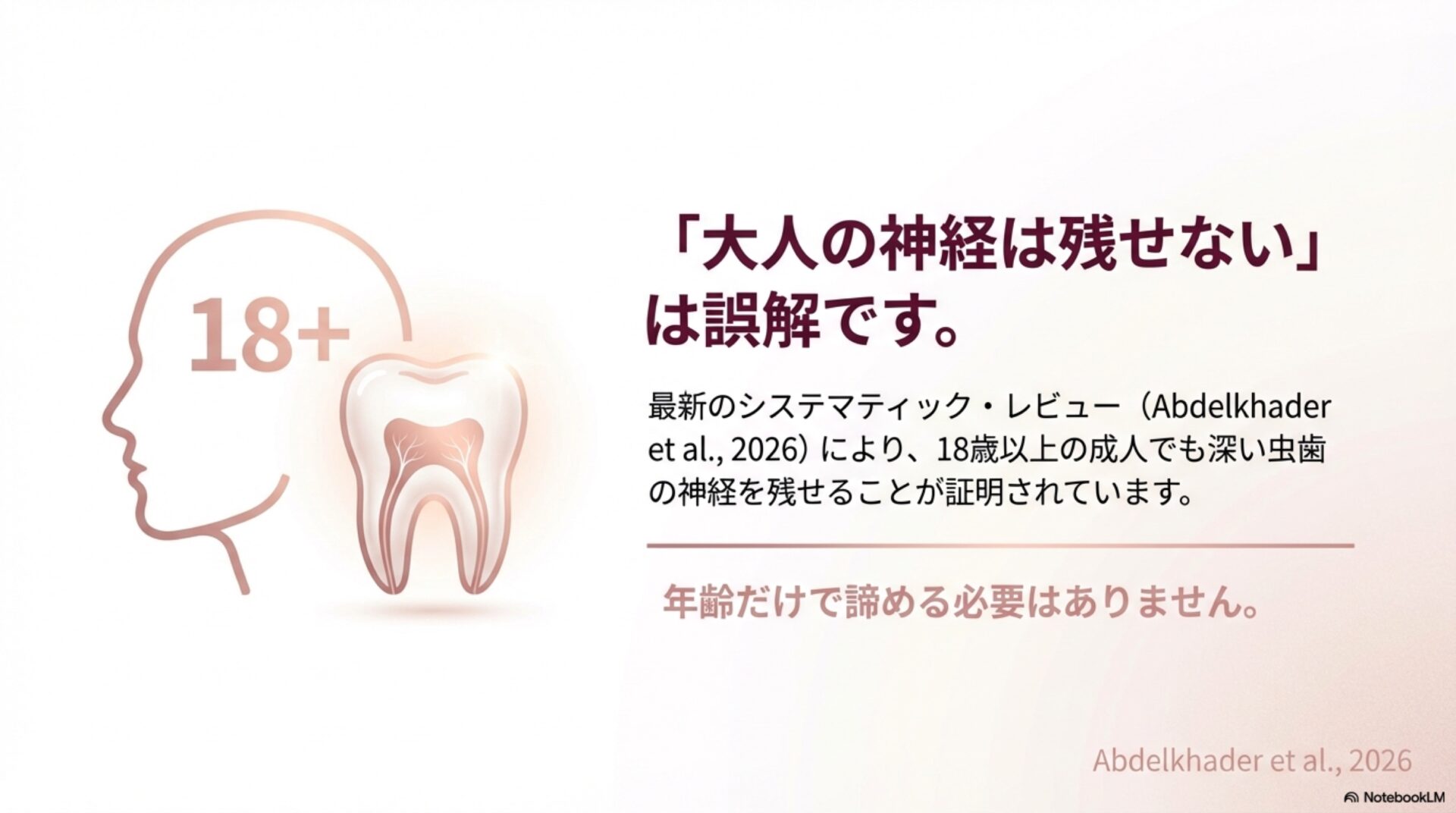 これは歯科治療における大きなパラダイムシフトです。これまで根管治療しか選択肢がなかった多くの歯が、神経を生かしたまま保存できる可能性が出てきたことを意味します。これは、Abdelkhader氏やRiandani氏らが行った近年の研究でも示されている、より身体に優しく、歯の寿命を延ばすための保守的なアプローチと言えるでしょう。