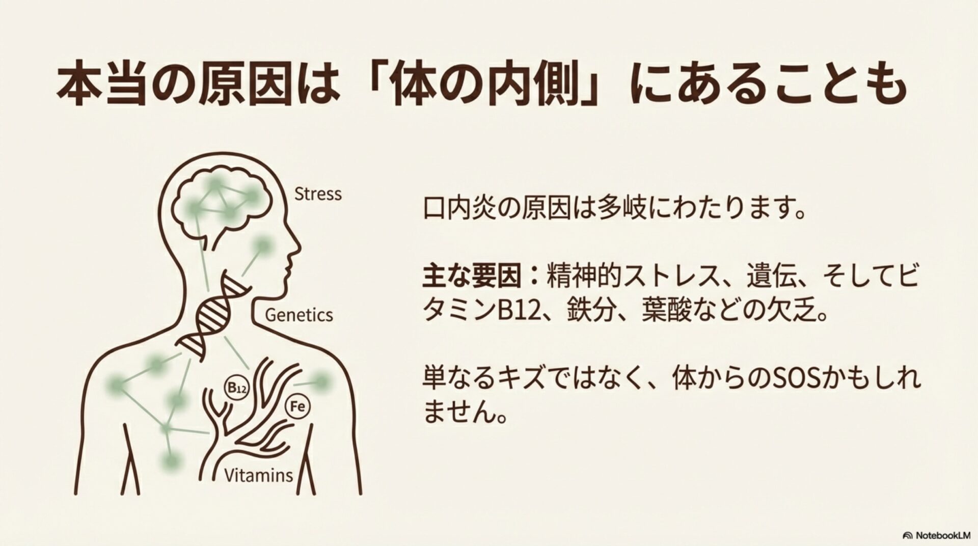 口内炎の原因は一つではなく、これらの複合的な要因が絡み合って発症することが多いのです。