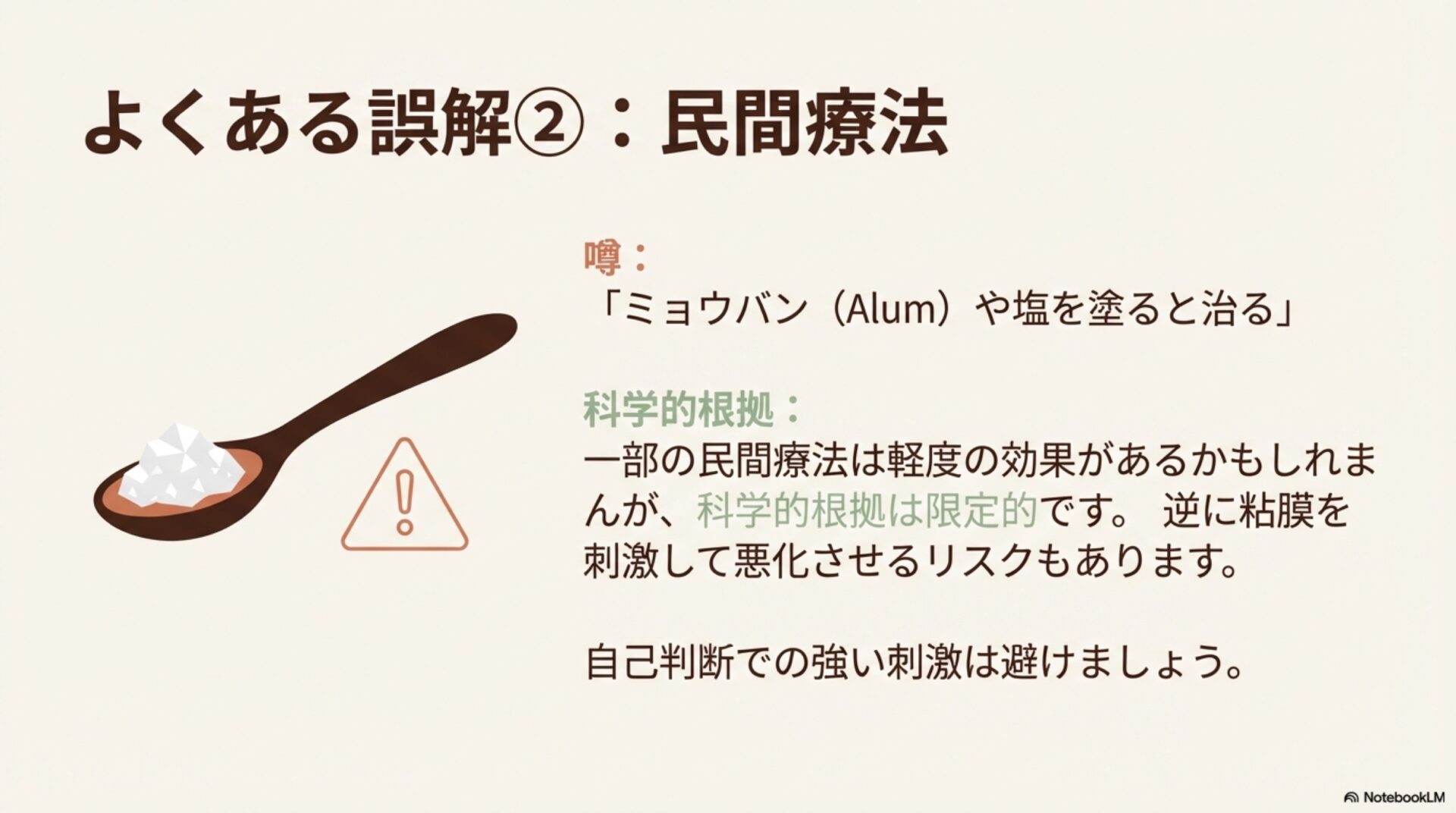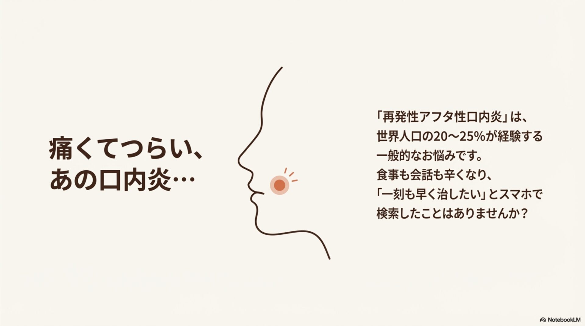 なぜ、質の低い情報が溢れてしまうのでしょうか。論文の著者は、この背景には、ユーザーが口内炎の根本的な原因や病態生理よりも、今ある痛みを和らげるための「手っ取り早い解決策」を求めていることがあるのではないかと考察しています。その結果、クリエイターも本質的な解説より、対症療法に偏ったコンテンツを優先してしまうのかもしれません。