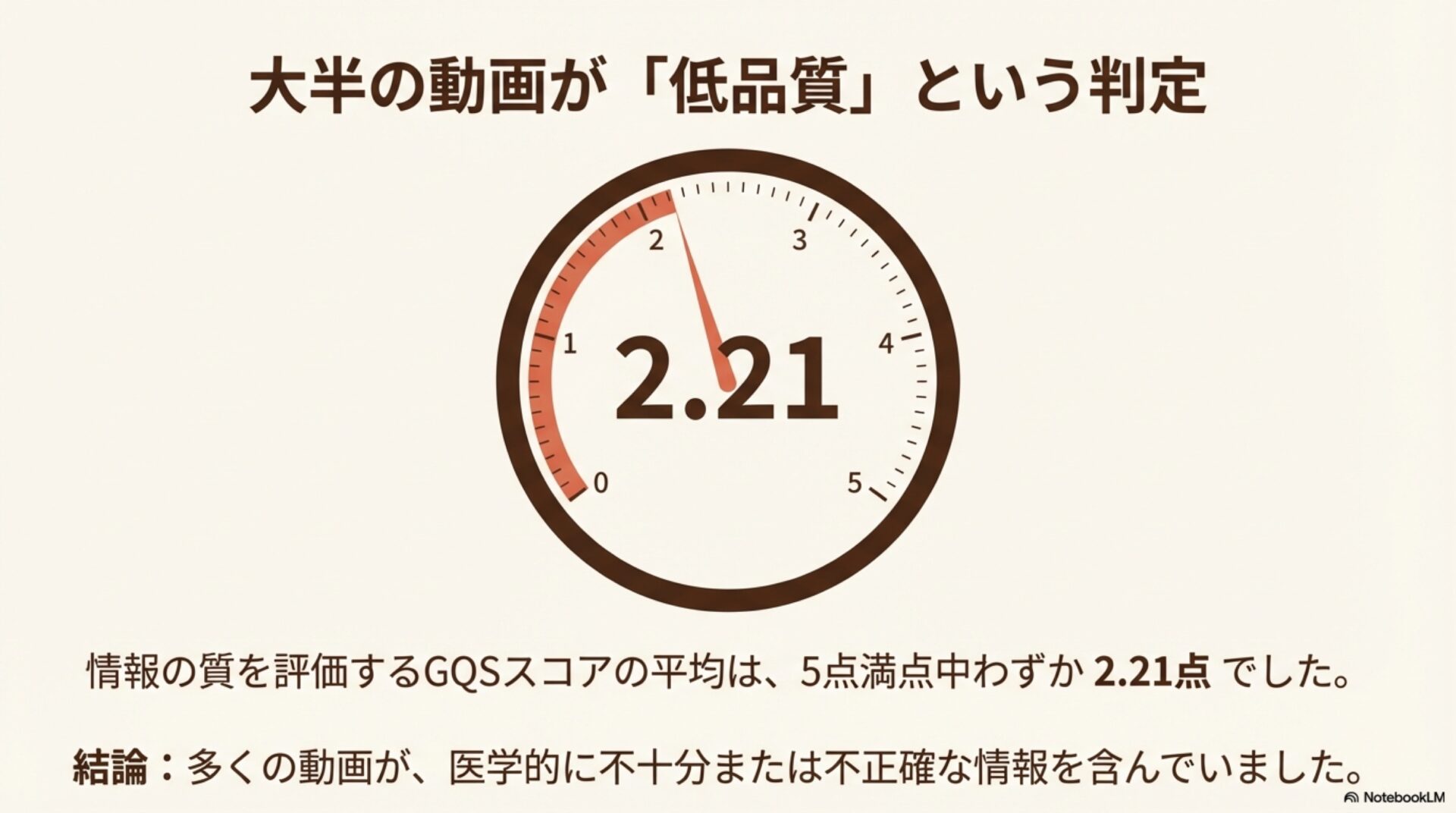 研究では83本の動画を分析し、その全体的な品質を「Global Quality Score (GQS)」という5点満点の指標で評価しました。その結果、平均点はわずか2.21点でした。論文の言葉を借りれば、「全体として動画の質は悪かった(poor quality)」と結論付けられています。
