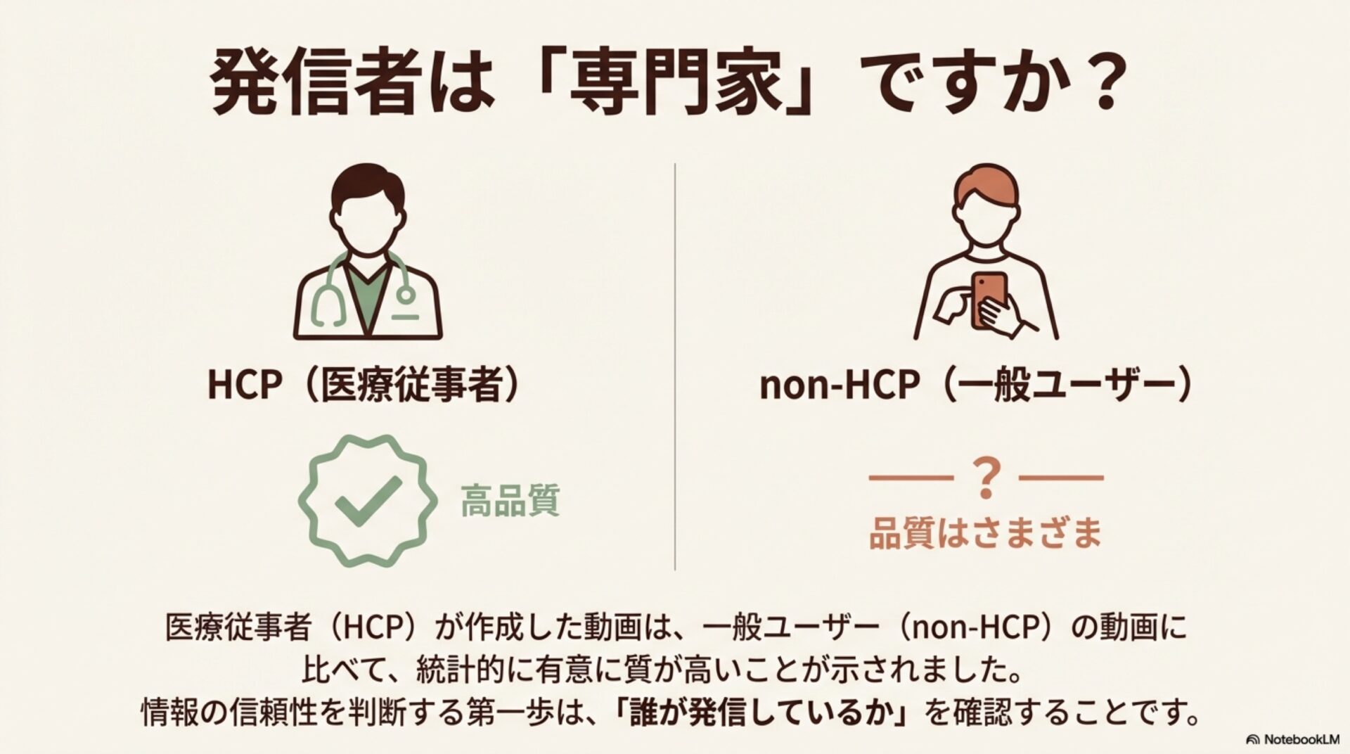 論文によると、医療従事者(HCPs)が投稿した動画は、そうでない人が投稿したものよりも品質が「統計的に有意に高かった」(p < 0.001)ことが示されました。これは予想通りの結果かもしれません。